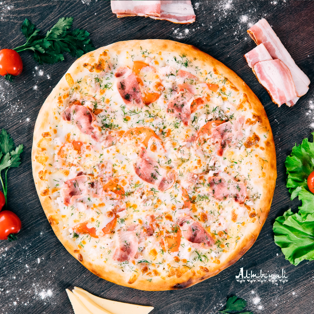 Сливочный соус, ветчина, грудка цыпленка копченая, помидоры, сыр для пиццы, бекон