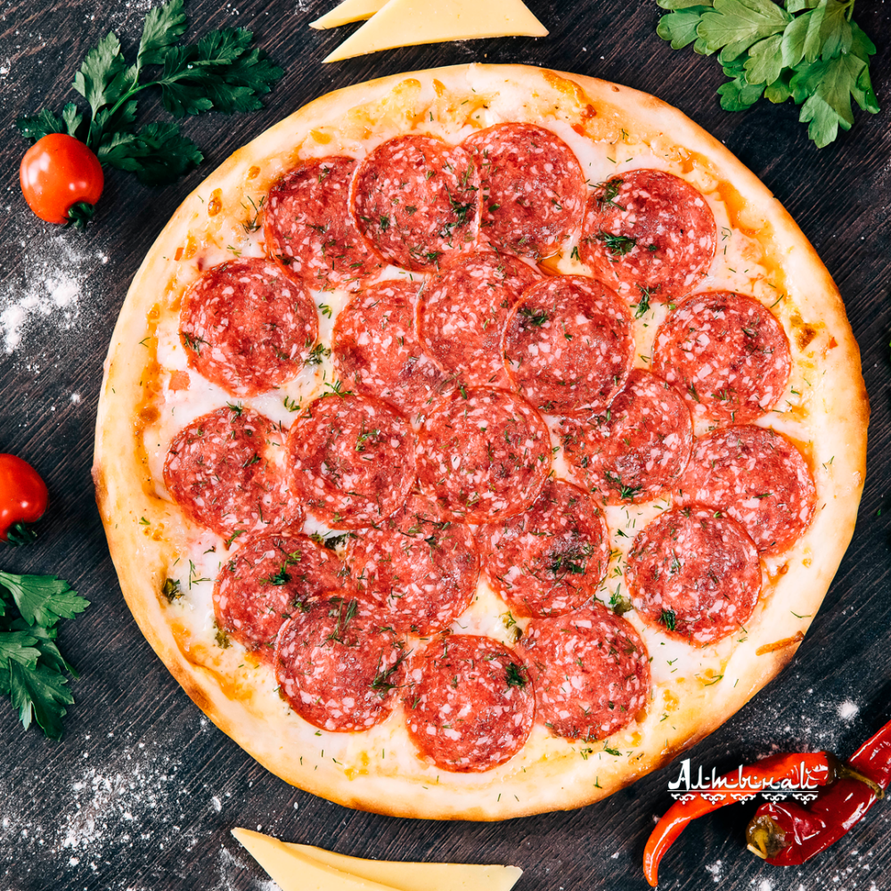 Спайси соус, помидоры, острый перец Халапеньо, сыр для пиццы, салями