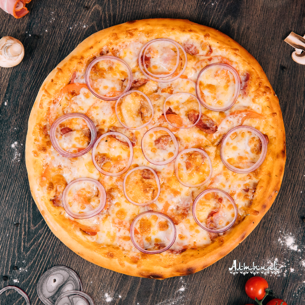 Фирменный соус, охотничьи колбаски, бекон, помидоры, сыр для пиццы, лук