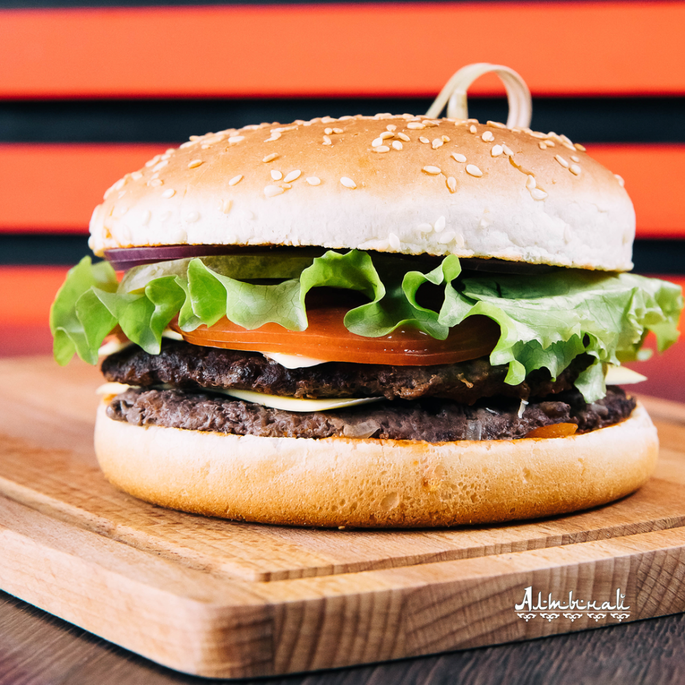 Двойная котлета из говядины, большая булочка для бургера, лук, огурцы маринованные, двойной сыр Чеддер, помидор, капуста пекинская