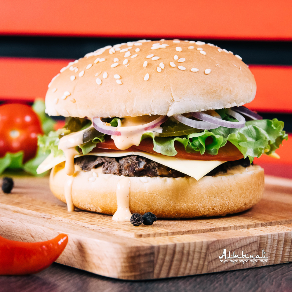 Котлета из говядины, большая булочка для бургера, лук, сыр Чеддер, помидор, перец острый халапеньо, капуста пекинская, соус Спайси