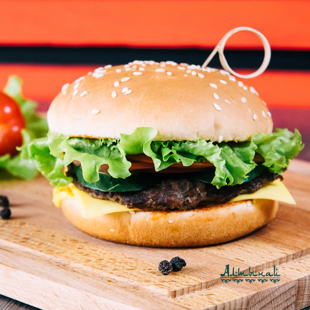 Котлета из говядины, большая булочка для бургера, огурец свежий, сыр Чеддер, помидор, капуста пекинская
