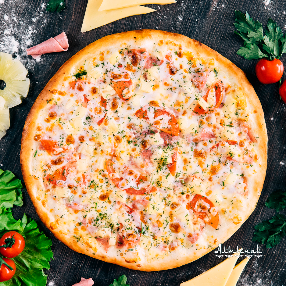 Остро-сливочный соус, грудка цыпленка копченая, сыр для пиццы, ананасы